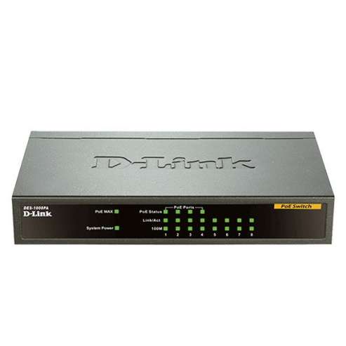 The DES-1008PA 8-Port Fast Ethernet PoE Desktop Switch enables both home and offi ce users to easily connect and supply power to Power over Ethernet (PoE) devices such as wireless Access Points (APs), IP cameras, and IP phones while adding more Ethernet devices like computers, printers, and Network Attached Storage (NAS) onto a network. Built with home and small business users in mind, this compact PoE switch operates silently, making it ideal for use in virtually any room or office.